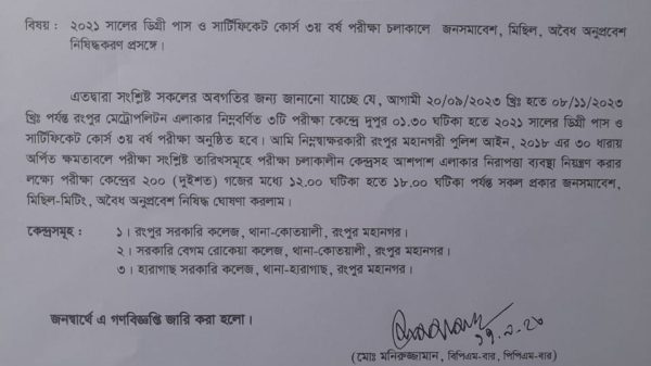 গণবিজ্ঞপ্তি ২০২১ সালের ডিগ্রী পাস ও সাঠিফিকেট কোর্স ৩য় বর্ষ পরীক্ষা চলাকালে জনসমাবেশ, মিছিল, অবৈধ অনুপ্রবেশ নিষিদ্ধকরণ প্রসঙ্গে