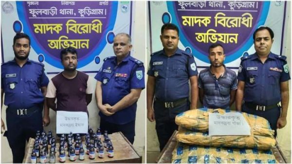 কুড়িগ্রাম জেলা পুলিশ সুপার এর নির্দেশ ক্রমে চলমান মাদক বিরোধী অভিযানের ধারাবাহিকতার অংশ হিসেবে ফুলবাড়ি থানা পুলিশের বিশেষ পৃথক দুটি অভিযানে ১৪ কেজি ২০০ গ্রাম গাঁজা ও ৫০ বোতল