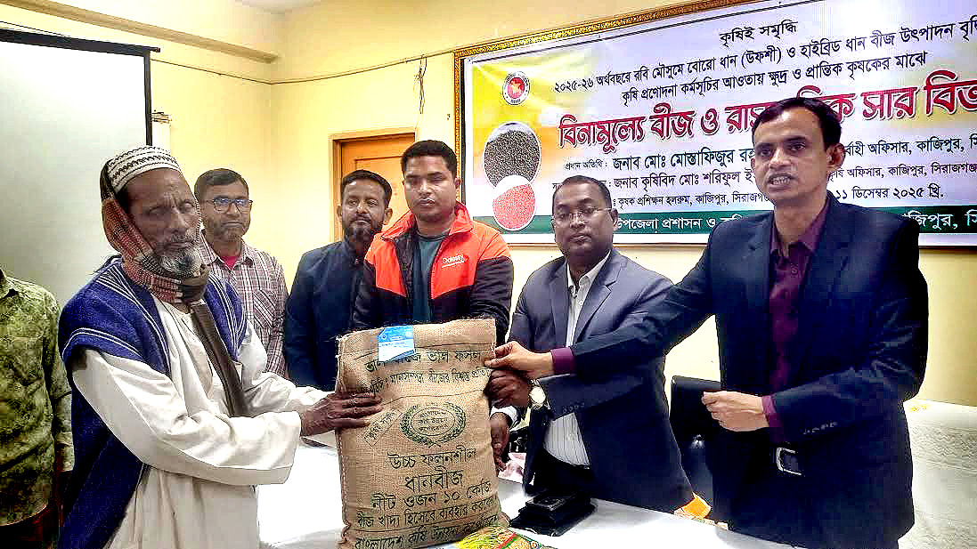 ২০২৫-২৬ খ্রিঃ অর্থ বছরে রবি মৌসুমে বোরো ধানবীজ (উফসী)  ও  হাইব্রিড ধানবীজ উৎপাদন বৃদ্ধির লক্ষ্যে কৃষি প্রণোদনার কর্মসূচি আওতায় – সিরাজগঞ্জ কাজিপুরে ক্ষুদ্র ও প্রান্তিক কৃষক-কৃষাণীদের মাঝে বিনামূল্যে বীজ ও রাসায়নিক সার বিতরণ কার্যক্রমের  উদ্বোধন করা হয়। কাজিপুর উপজেলার ১২ টি ইউনিয়ন ও একটি পৌরসভার  মোট এক হাজার আট শত জন প্রত্যেক কৃষক ৫’কেজি করে বীজ, ১০’ কেজি করে এমওপি ও ১০’কেজি ডিওপি সার দেওয়া হয়। এছাড়াও সাত’শ প্রান্তিক কৃষকদের ৫’কেজি করে হাইব্রিড ধানবীজ দেওয়া হয়।