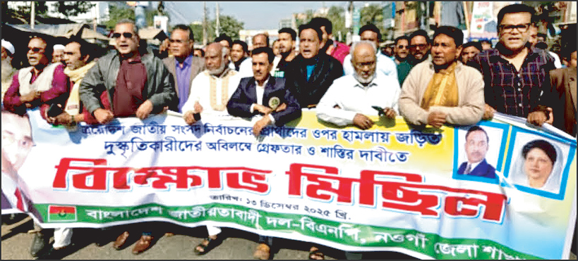 ইনকিলাব মঞ্চের মুখপাত্র ও আসন্ন জাতীয় সংসদ নির্বাচনে ঢাকা-৮ আসনের স্বতন্ত্র সংসদ সদস্য পদপ্রার্থী শরিফ ওসমান হাদির উপর গুলিবর্ষণ এবং সারাদেশে এমপি প্রার্থীদের উপর ধারাবাহিক হামলার প্রতিবাদে নওগাঁয় বিক্ষোভ মিছিল ও সমাবেশ করেছে বিভিন্ন রাজনৈতিক দল। তারই ধারাবাহিকতায় আজ দুষ্কৃতিকারীদের অবিলম্বে গ্রেফতার ও দৃষ্টান্তমূলক শাস্তির দাবিতে বিক্ষোভ মিছিল করেছে বাংলাদেশ জাতীয়তাবাদী দল (বিএনপি) নওগাঁ জেলা শাখা। শনিবার (১৩ ডিসেম্বর) নওগাঁ শহরে আয়োজিত এই বিক্ষোভ মিছিলে জেলা বিএনপি ও এর অঙ্গ-সহযোগী সংগঠনের বিপুলসংখ্যক নেতাকর্মী অংশগ্রহণ করেন। মিছিলটি শহরের গুরুত্বপূর্ণ সড়ক প্রদক্ষিণ শেষ নওযোয়ান মাঠে সংক্ষিপ্ত সমাবেশের মাধ্যমে শেষ হয়।