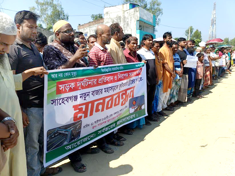 রায়গঞ্জে নিরাপদ সড়ক ও ফুটওভার ব্রিজ নির্মাণের দাবিতে মানববন্ধন