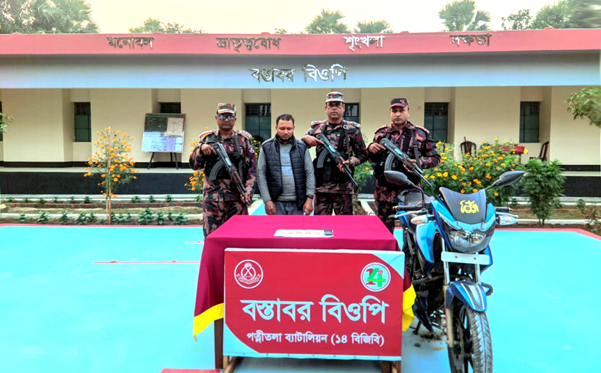 নওগাঁর ধামইরহাট সীমান্তে বিপুল পরিমাণ মাদক দ্রব্য আটক করেছে।  ২৬ ডিসেম্বর ১৭০০ ঘটিকায় বস্তাবর বিওপি’র টহল কমান্ডার সুবেদার মোঃ তৌফিকুল ইসলাম এর নেতৃত্বে একটি বিশেষ টহল দল সীমান্ত পিলার ২৬৩/৩-এস হতে আনুমানিক ৩.৫ কিঃমিঃ বাংলাদেশের অভ্যন্তরে ভেড়ম এলাকায় অভিযান পরিচালনা করে ৫০ পিস ভারতীয় নেশাজাতীয় ট্যাপেন্টাডল ট্যাবলেট, ০১টি মোবাইল এবং ০১টি মোটরসাইকেলসহ ০১ জন চোরাকারবারী মোঃ ওবাইদুল হক(৪২), পিতা-মোঃ গোলাম মোস্তফা, গ্রাম-কেশবপুর, পোস্ট-নাগরগোলা, থানা-পত্নীতলা এবং জেলা-নওগাঁকে আটক করতে সক্ষম হয়। আটককৃত আসামীর বিরুদ্ধে ধামইরহাট থানায় মামলা দায়ের পূর্বক মালামালসহ পুলিশের নিকট হস্তান্তর কার্যক্রম প্রক্রিয়াধীন।