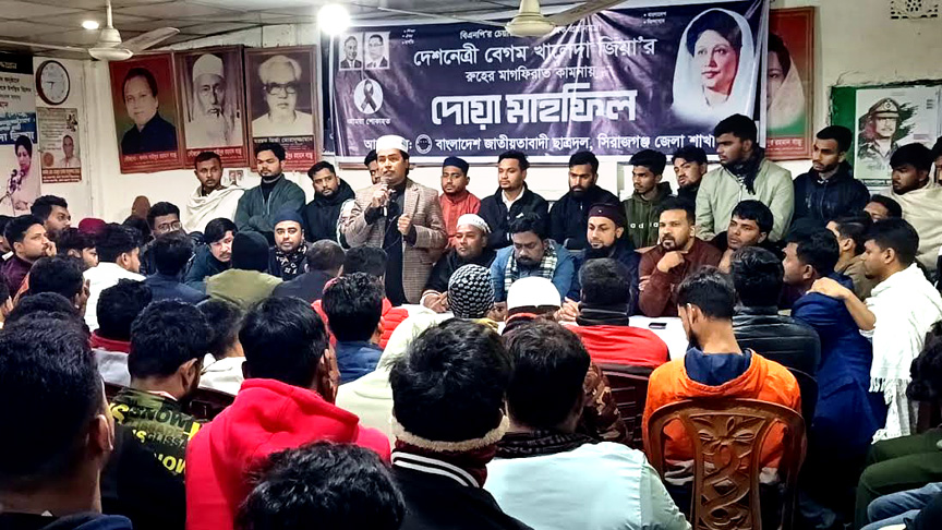 বাংলাদেশের প্রথম নারী প্রধানমন্ত্রী ও বিএনপি চেয়ারপারসন বেগম খালেদা জিয়ার আত্মার মাগফিরাত কামনা করে সিরাজগঞ্জে দোয়া ও মিলাদ মাহফিল অনুষ্ঠিত হয়েছে। শুক্রবার সন্ধ্যা সাড়ে ৬টার দিকে সিরাজগঞ্জ জেলা বিএনপি কার্যালয়ে জেলা ছাত্রদলের উদ্যোগে এই অনুষ্ঠানের আয়োজন করা হয়।